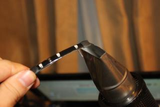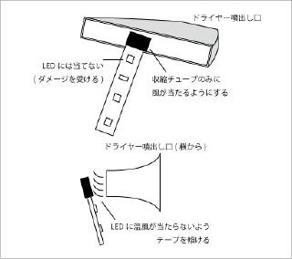 テープを傾けてチューブを温め、LEDに熱風がかからないようにします。